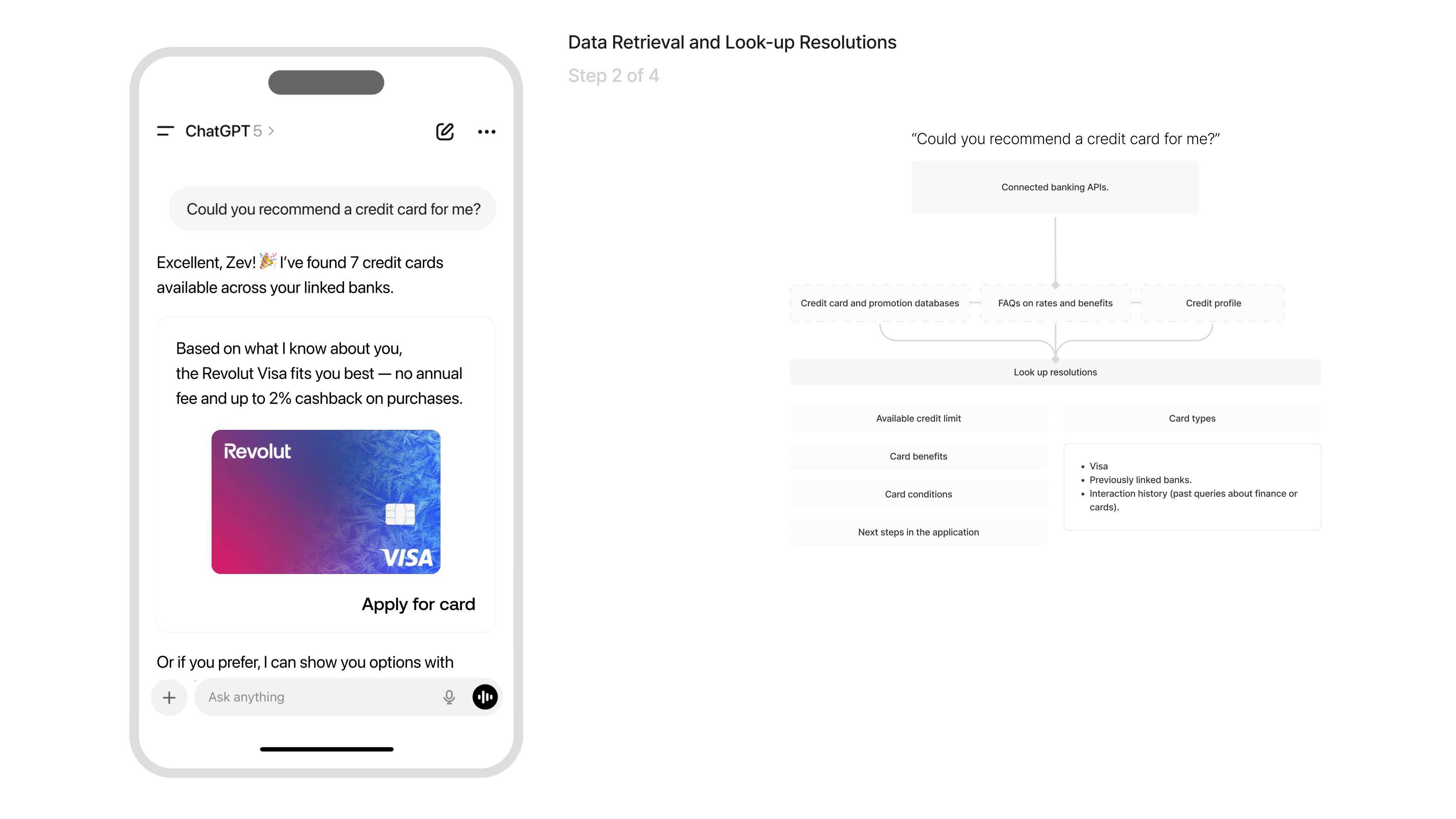 ChatGPT connects to banking APIs to retrieve real financial information such as available credit limits, active promotions, card conditions, and the user’s credit profile and uses this data to generate a tailored recommendation.