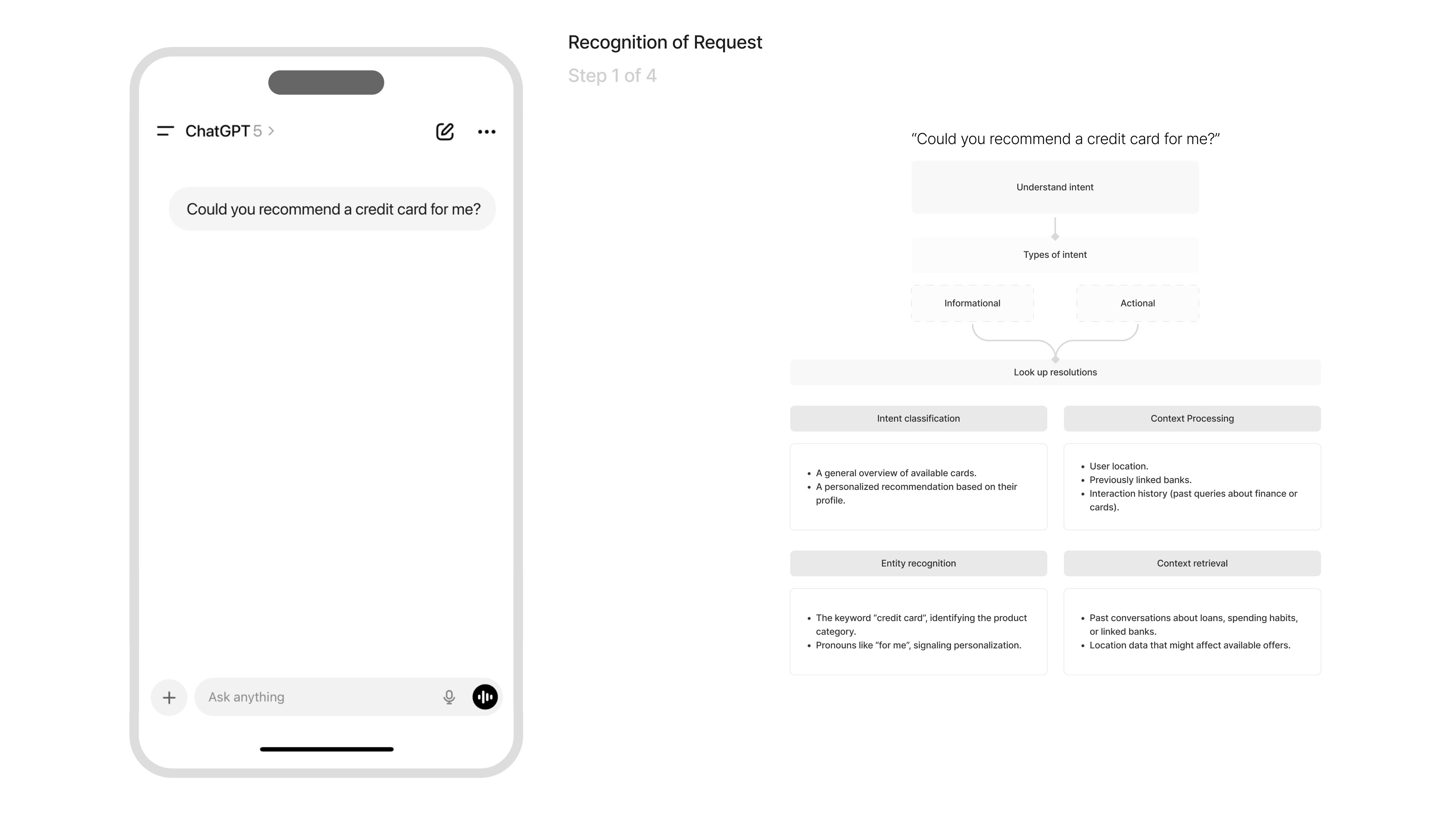 At this stage, the system interprets the message “Could you recommend a credit card for me?”.ChatGPT identifies the user’s goal (getting a credit card recommendation) and determines whether the request is informational or action-oriented.It then performs a structured lookup across different resolution paths: