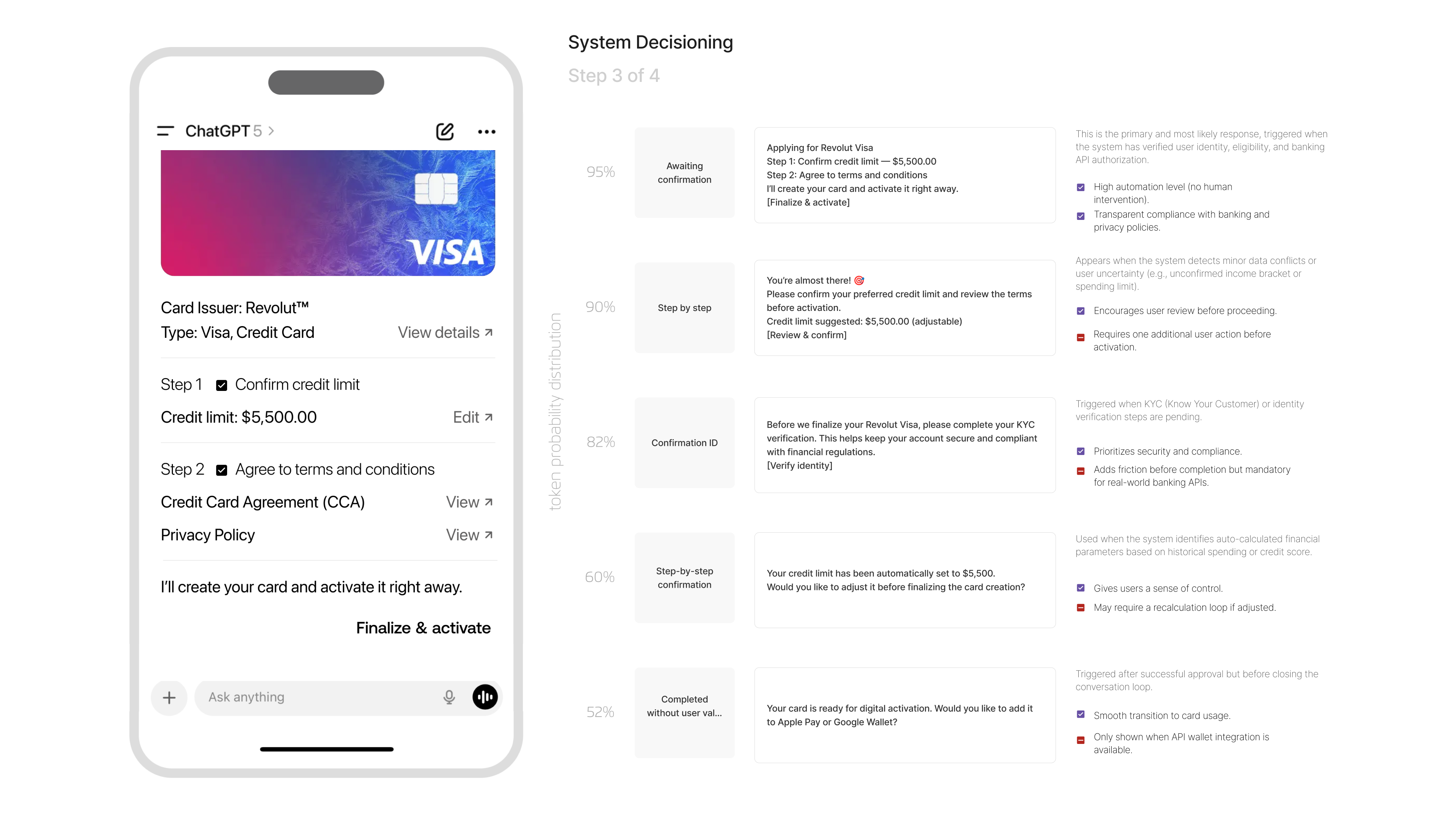 The model chooses between immediate confirmation, a step-by-step review, additional KYC validation, auto-calculated credit-limit confirmation, or even completing the process without user intervention if sufficient data is already verified.