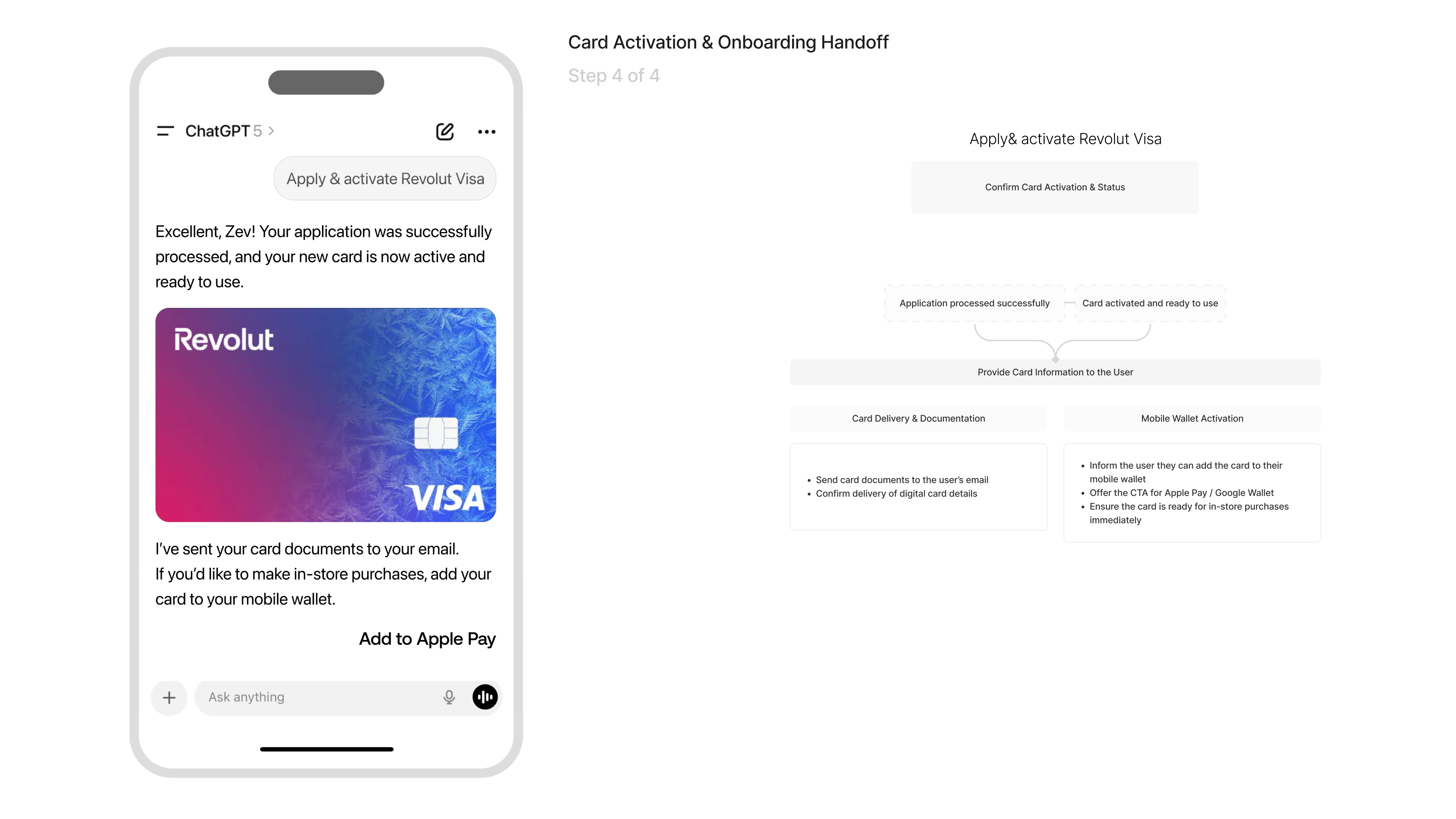 In the final step completes the process by activating the newly issued card and delivering all relevant digital documents to the user. The system then guides the user into immediate usage through mobile-wallet onboarding, offering a seamless call-to-action to add the card to Apple Pay or Google Wallet. This step closes the end-to-end journey by transitioning smoothly from approval to real-world usability, ensuring the user can start making purchases instantly through the same conversational interface.
