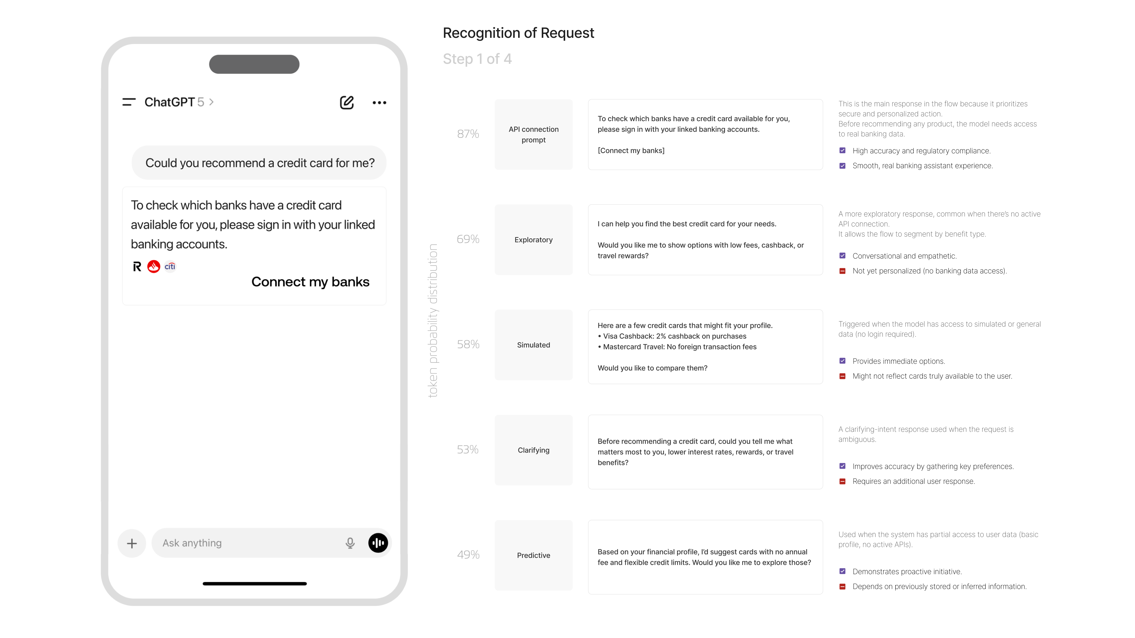 The system determines how it should present card recommendations by comparing different reasoning patterns ranging from highly personalized suggestions to broader comparative analysis or exploratory clarification based on the data retrieved through banking APIs.