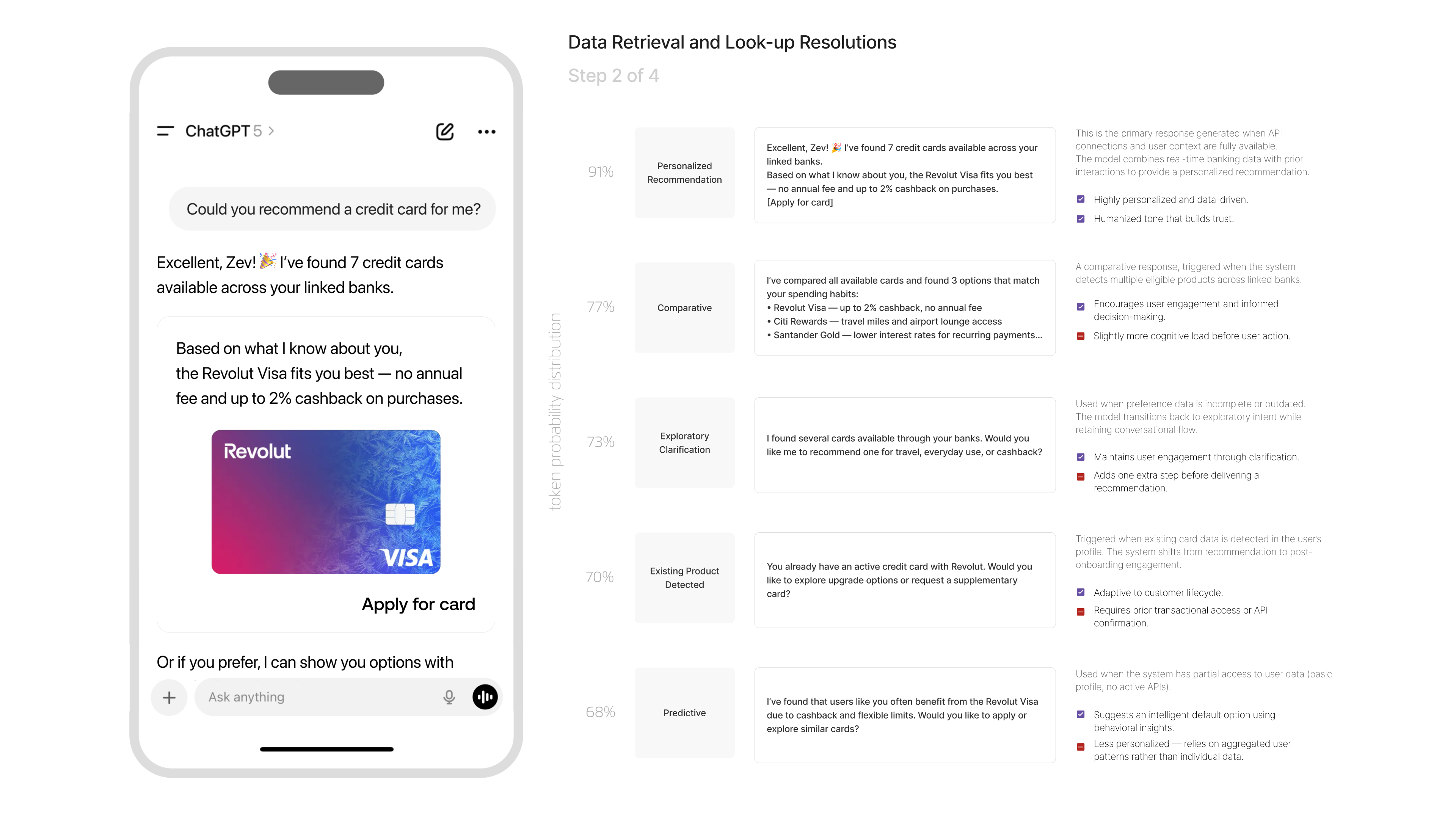 It evaluates which path will deliver the most relevant, trustworthy, and helpful answer depending on the completeness and freshness of the user’s data. By understanding whether the user already has a card, whether their preferences are known, or whether predictive modelling might be helpful, the model selects the most appropriate conversation style.