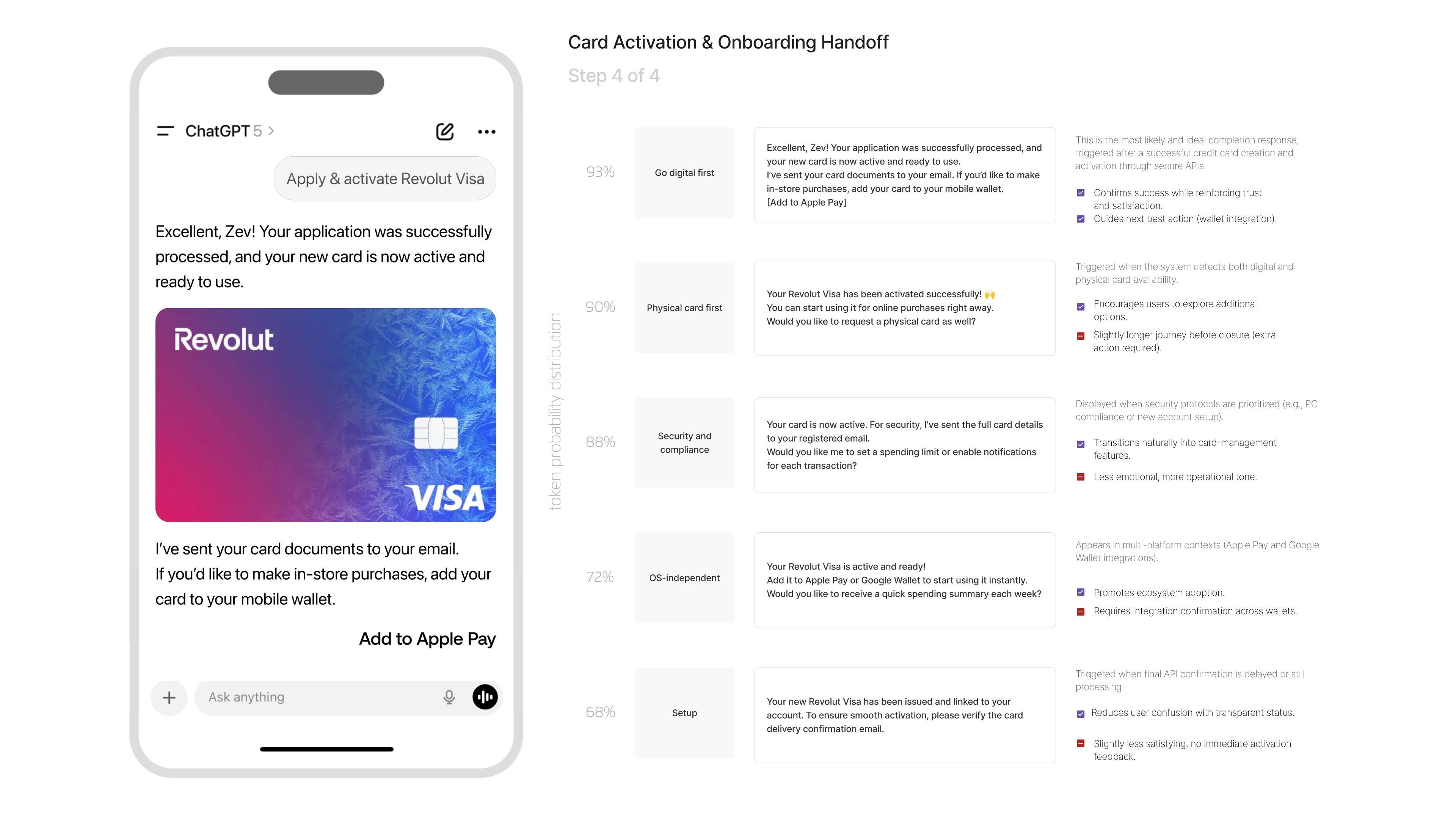 Based on the final API confirmation, it may emphasize digital activation with Apple Pay, offer the option to request a physical card, transition into a security-focused message, or provide an OS-independent handoff compatible with both Apple and Google wallets.
