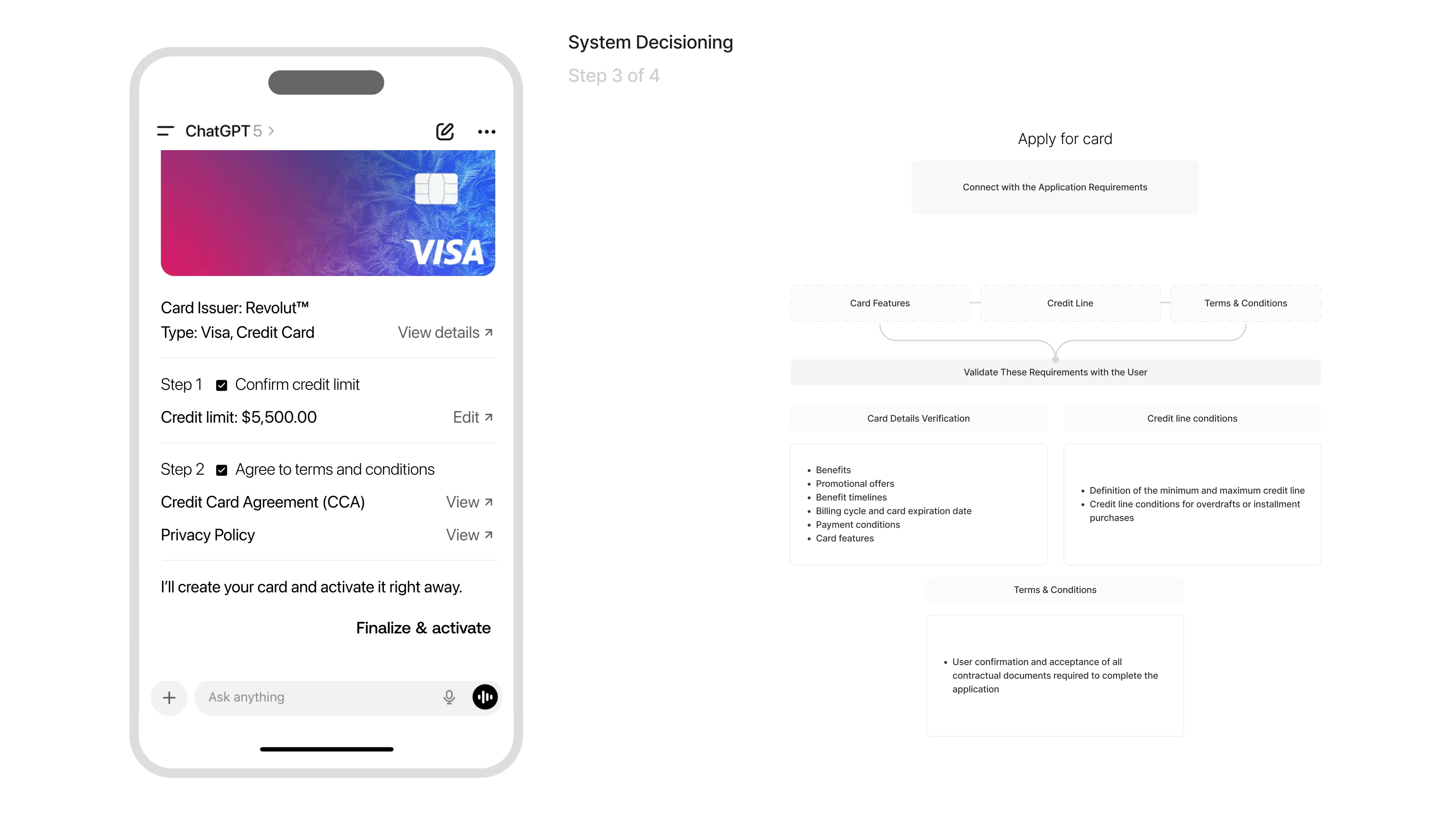 Step 3 focuses on the approval and creation of the credit card, where ChatGPT validates key requirements such as credit limits, eligibility, promotional benefits, and regulatory disclosures. The assistant guides the user through confirming the credit line and agreeing to the terms and conditions, while internally ensuring full compliance with credit-decision rules and KYC policies. This phase reflects how the system can automate complex financial decisioning behind the scenes while keeping the user experience simple, transparent, and friction-controlled.